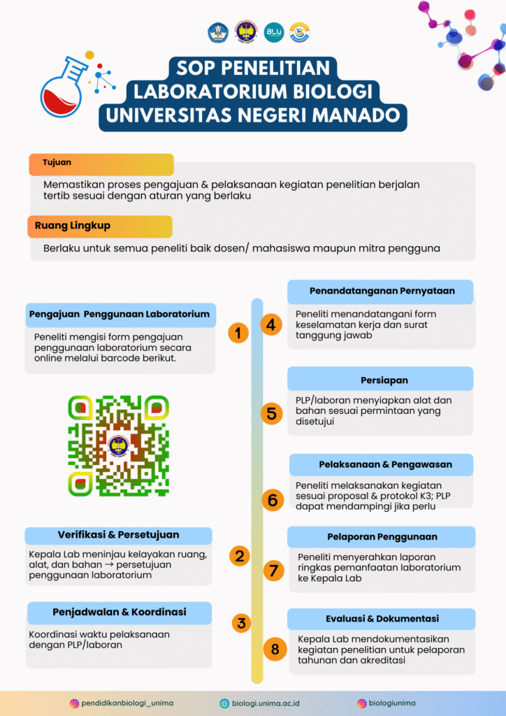 Pelaksanaan penelitian di Laboratorium Biologi Universitas Negeri Manado wajib mengikuti Standar Operasional Prosedur (SOP) yang telah ditetapkan. Silakan baca SOP tersebut dengan saksama. Untuk pengajuan penggunaan laboratorium, harap melakukan pemindaian (scan) kode QR yang tersedia.