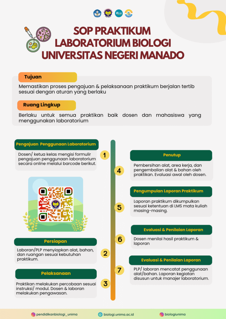 Pelaksanaan praktikum di Laboratorium Biologi Universitas Negeri Manado wajib mengikuti Standar Operasional Prosedur (SOP) yang telah ditetapkan. Silakan baca SOP tersebut dengan saksama. Untuk pengajuan penggunaan laboratorium, harap melakukan pemindaian (scan) kode QR yang tersedia.